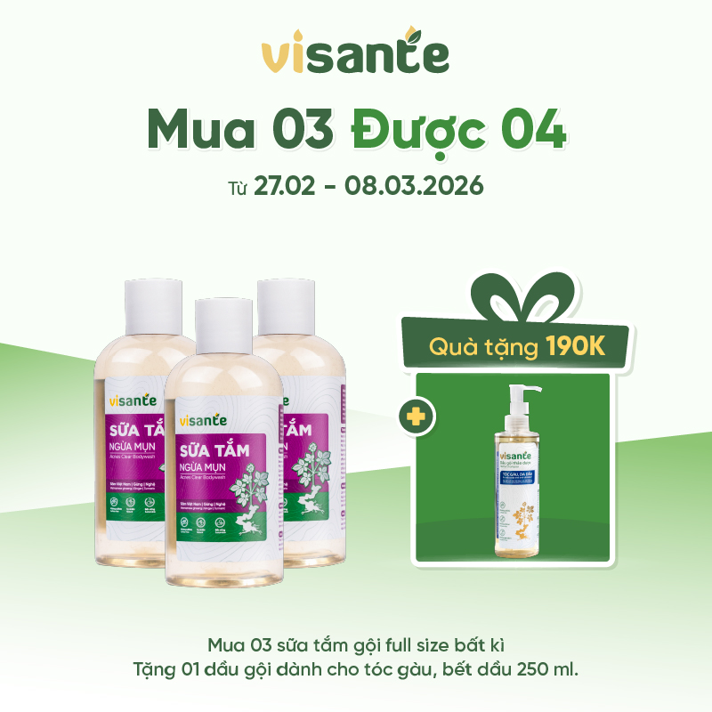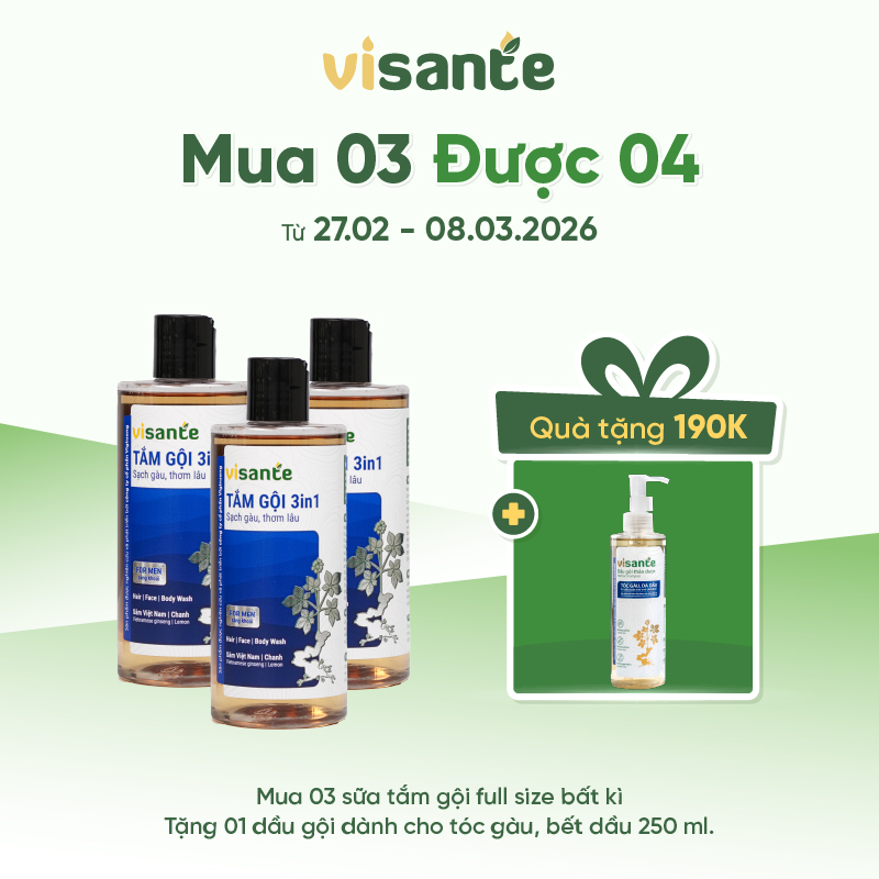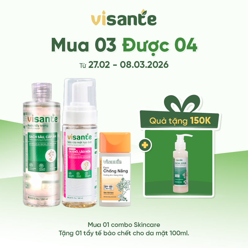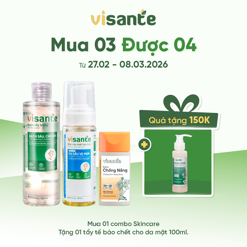 Tận hưởng liệu trình làm sạch chuyên sâu với trọn bộ 3 bước thiết yếu từ Sâm Việt Nam và Dược Liệu Tự Nhiên VISANTE, được thiết kế chuyên biệt cho làn da dầu mụn. Combo giúp làm sạch sâu, kiểm soát dầu nhờn, giảm bít tắc lỗ chân lông và hỗ trợ ngăn ngừa mụn tái phát, cho làn da sạch thoáng – khỏe mạnh – đều màu hơn mỗi ngày.