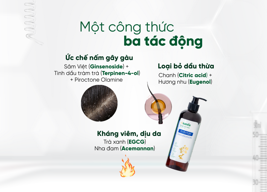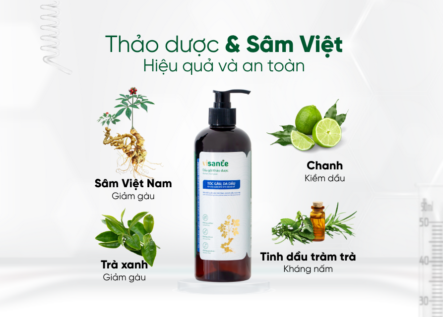 • Chiết xuất từ thiên nhiên: Chiết xuất sâm Việt Nam, tinh dầu tràm trà, chiết xuất trà xanh, chiết xuất lô hội, chiết xuất chanh và chiết xuất hương nhu tía giúp nuôi dưỡng tóc khỏe mạnh và giúp làm dịu da đầu.