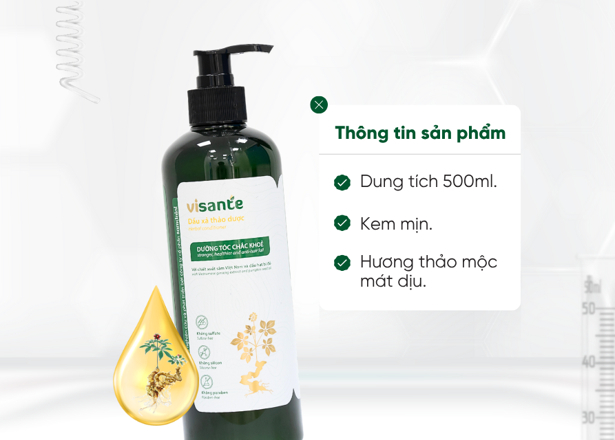 Dầu xả thảo dược dưỡng tóc chắc khỏe 500 ml visante với chiết xuất từ thiên nhiên, giúp dưỡng ẩm sâu, phục hồi hư tổn, giảm gãy rụng và làm mềm tóc, mang đến mái tóc suôn mượt, chắc khỏe từ gốc đến ngọn.