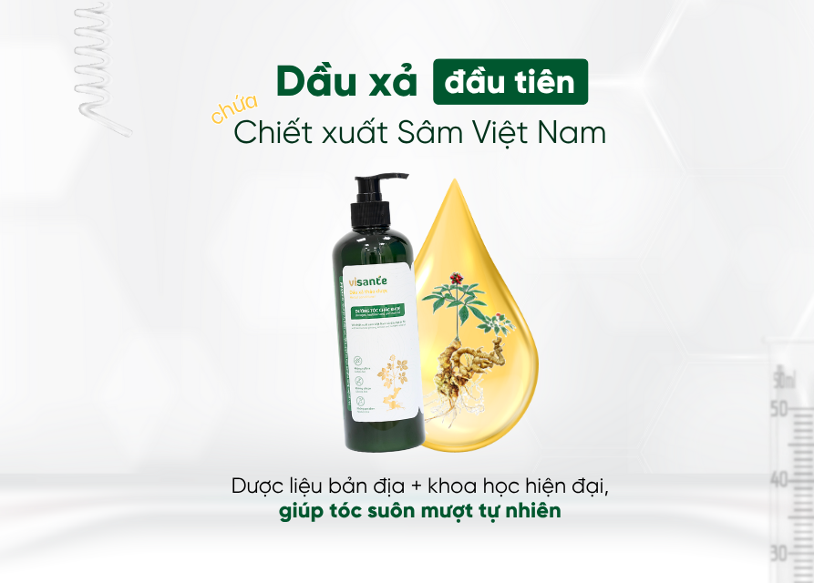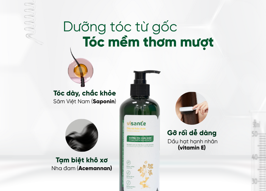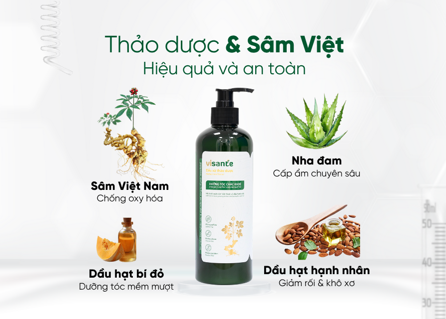 Thành phần chính: Chiết xuất Sâm Việt Nam, dầu hạt bí đỏ, chiết xuất lô hội, chiết xuất trà xanh, tinh dầu vỏ bưởi, dầu hạnh nhân,…