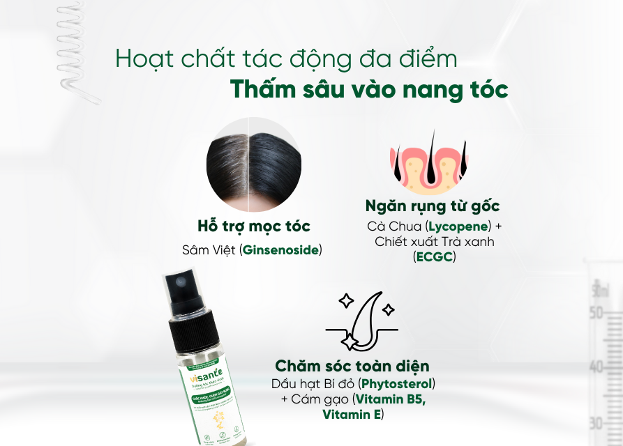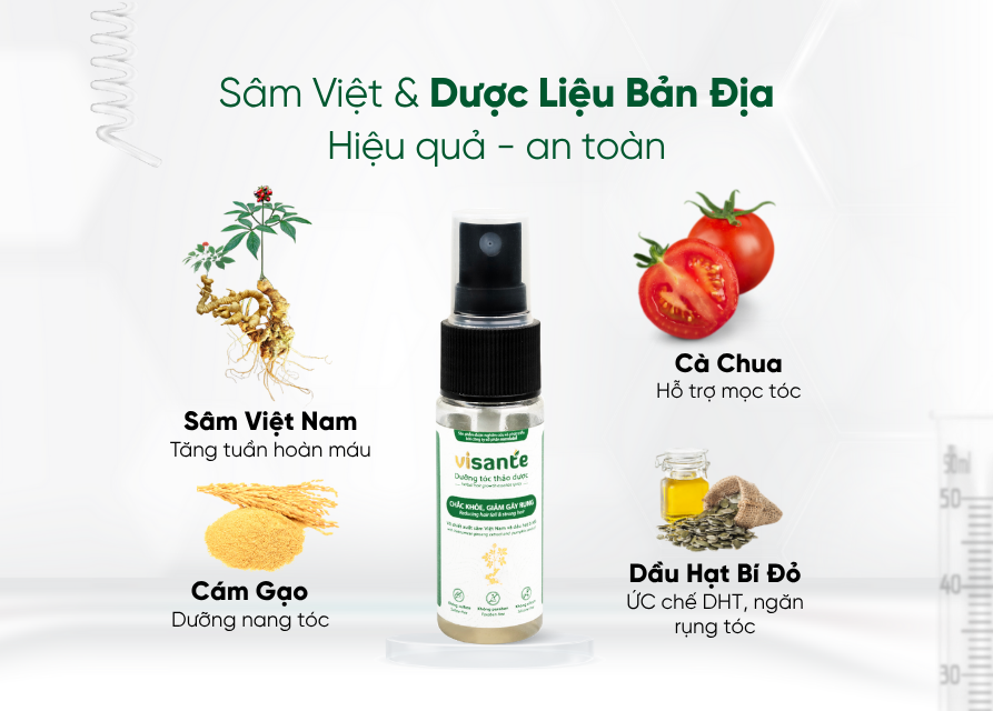 Thành phần chính: Chiết xuất sâm Việt Nam, dầu hạt bí đỏ, chiết xuất hương thảo, tinh dầu vỏ bưởi, chiết xuất trà xanh, chiết xuất cám gạo, chiết xuất cà chua,…