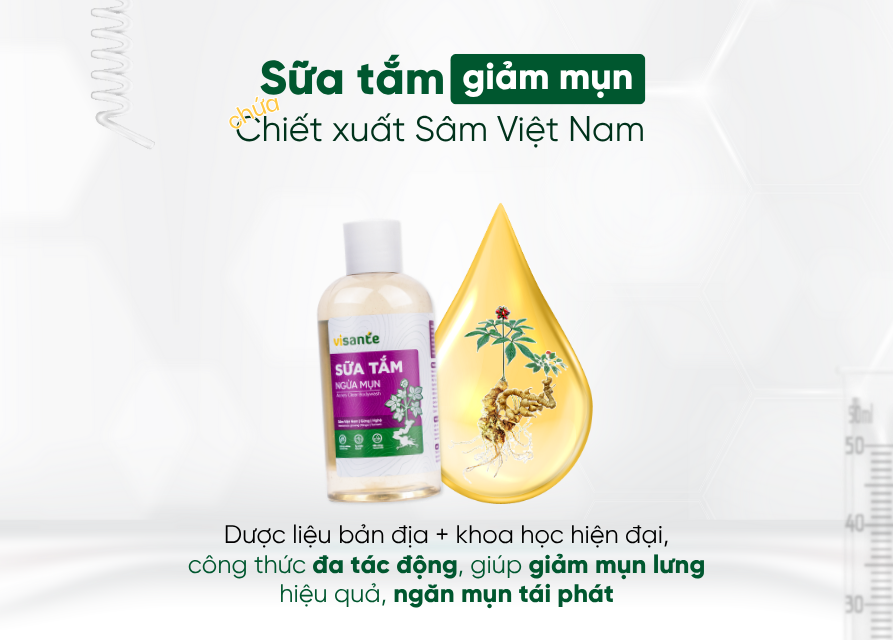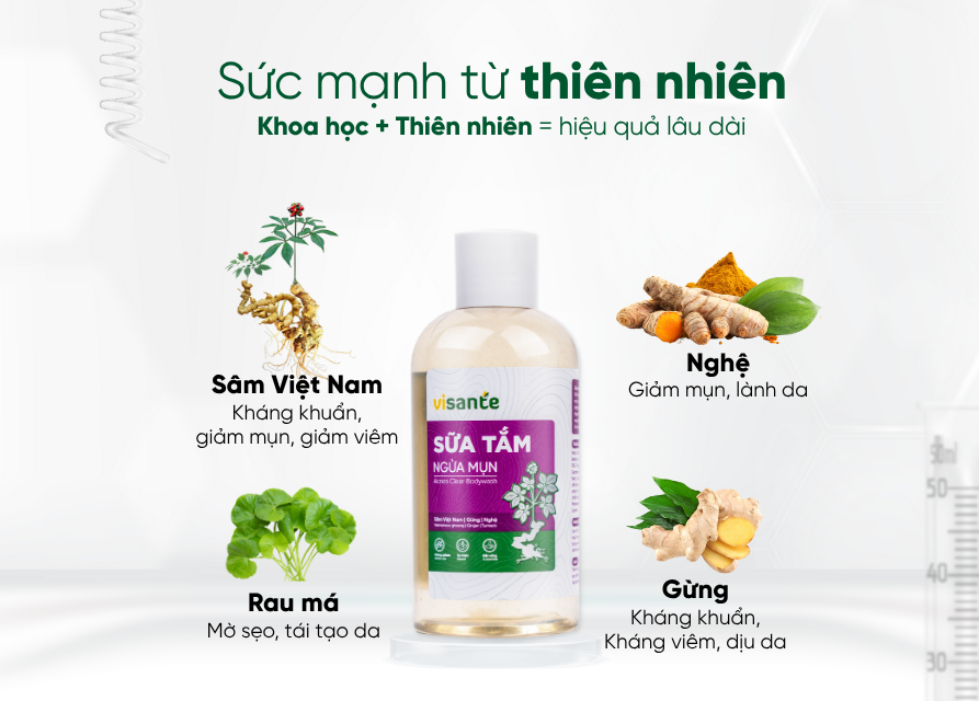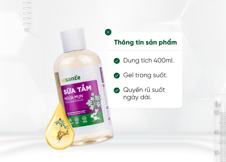 Sữa tắm ngừa mụn visante 400 ml là sản phẩm chăm sóc da toàn diện, được thiết kế đặc biệt để giúp làm sạch sâu, kháng khuẩn và dưỡng ẩm hiệu quả. Với công thức chiết xuất sâm Việt Nam, gừng và nghệ cùng các thành phần thiên nhiên an toàn, sản phẩm không chỉ giúp làm sạch bụi bẩn, dầu thừa, ngừa mụn lưng mà còn nuôi dưỡng làn da khỏe mạnh từ bên trong, giữ da luôn mềm mại và mịn màng.