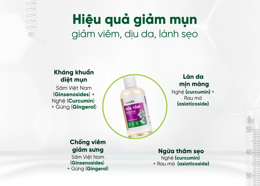 Làm sạch sâu, kháng khuẩn: Công thức kết hợp chiết xuất sâm Việt Nam, chiết xuất gừng và nghệ giúp loại bỏ bụi bẩn, bã nhờn, ngăn ngừa vi khuẩn gây mụn, giữ làn da luôn sạch sẽ và thông thoáng.