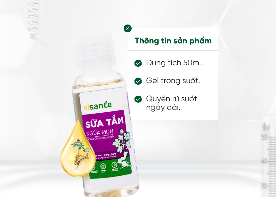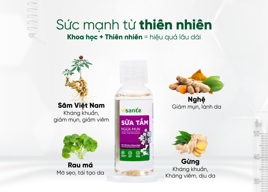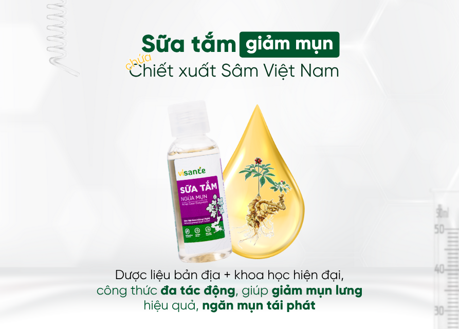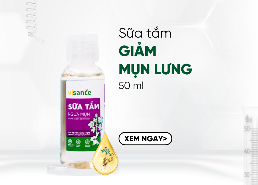 Sữa tắm ngừa mụn visante 50 ml là sản phẩm chăm sóc da toàn diện, được thiết kế đặc biệt để giúp làm sạch sâu, kháng khuẩn và dưỡng ẩm hiệu quả. Với công thức chiết xuất sâm Việt Nam, gừng và nghệ cùng các thành phần thiên nhiên an toàn, sản phẩm không chỉ giúp làm sạch bụi bẩn, dầu thừa, ngừa mụn lưng mà còn nuôi dưỡng làn da khỏe mạnh từ bên trong, giữ da luôn mềm mại và mịn màng.