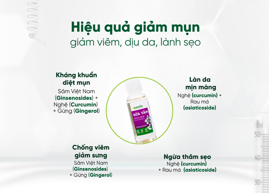 Làm sạch sâu, kháng khuẩn: Công thức kết hợp chiết xuất sâm Việt Nam, chiết xuất gừng và nghệ giúp loại bỏ bụi bẩn, bã nhờn, ngăn ngừa vi khuẩn gây mụn, giữ làn da luôn sạch sẽ và thông thoáng.