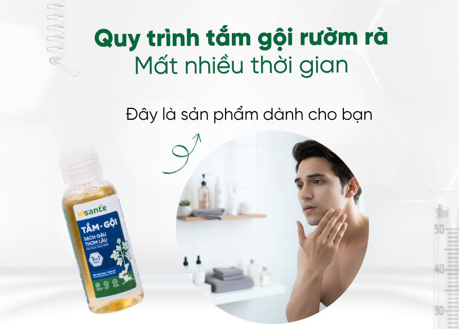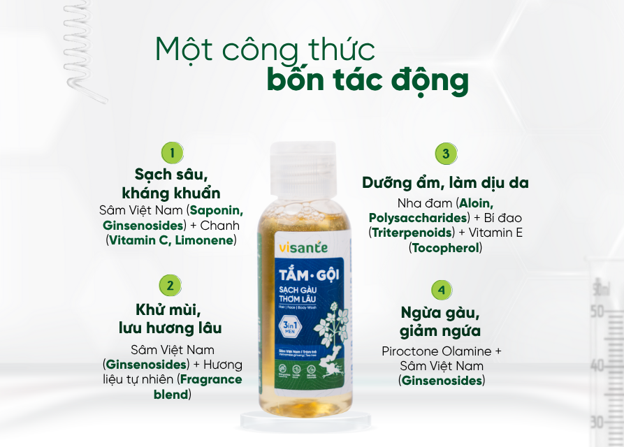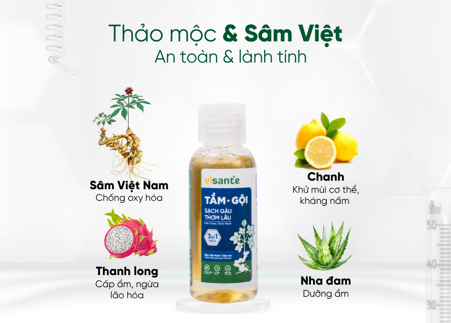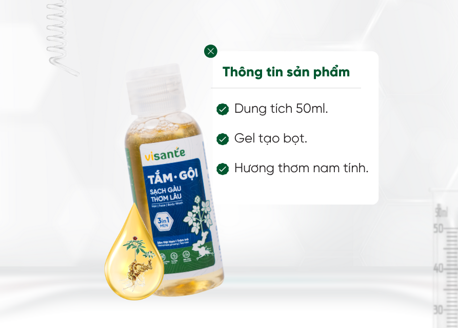 Tắm gội 3IN1 dành cho nam visante 50 ml với chiết xuất sâm Việt Nam và chiết xuất Chanh, làm sạch sâu từ da đến tóc, ngừa gàu và giảm ngứa da đầu hiệu quả. Hương thơm nam tính, mạnh mẽ, giúp bạn tự tin suốt ngày dài. Tiết kiệm thời gian, chăm sóc toàn diện, mang lại sức sống cho phái mạnh!