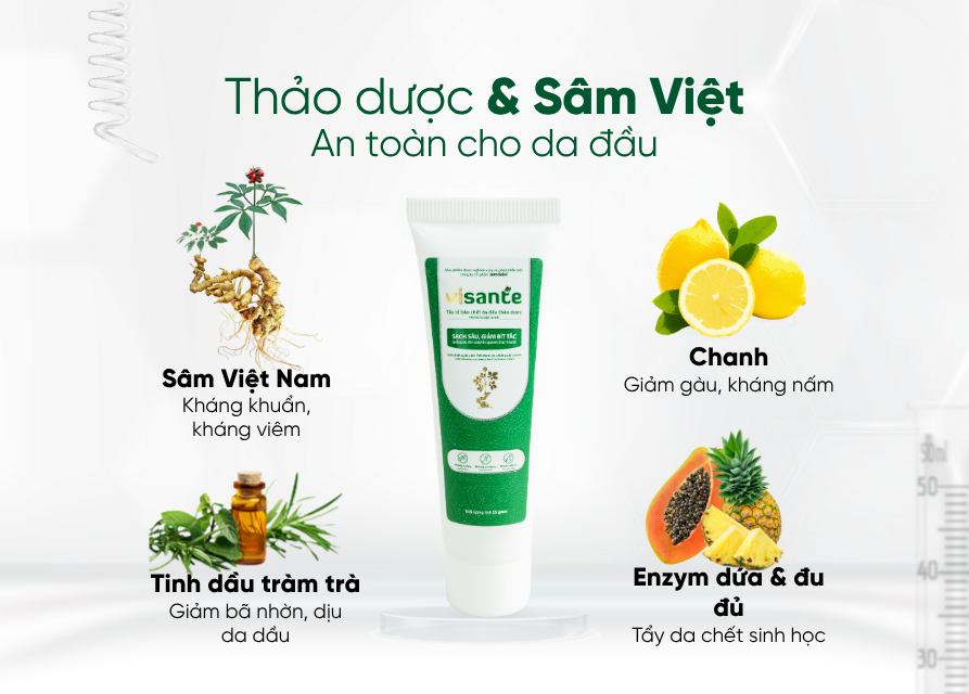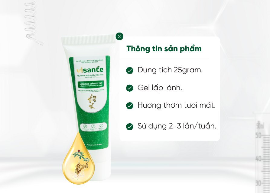 Tẩy tế bào chết da đầu thảo dược làm sạch sâu, giảm bít tắc 25 g visante với chiết xuất từ thiên nhiên, giúp làm sạch sâu, giảm bít tắc chân tóc và ngăn ngừa gàu, mang lại da đầu thông thoáng và tóc chắc khỏe hơn.