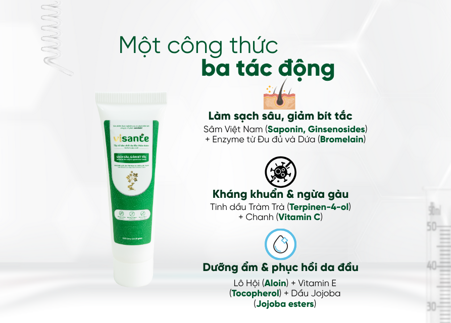 • Làm sạch sâu và ngăn ngừa gàu: Công thức thảo dược với chiết xuất sâm Việt Nam, chiết xuất chanh, enzyme papain từ đu đủ, enzyme bromelain từ dứa, tinh dầu tràm trà từ dứa giúp loại bỏ tế bào chết, làm sạch bụi bẩn và dầu thừa, ngăn ngừa gàu và giảm ngứa da đầu.